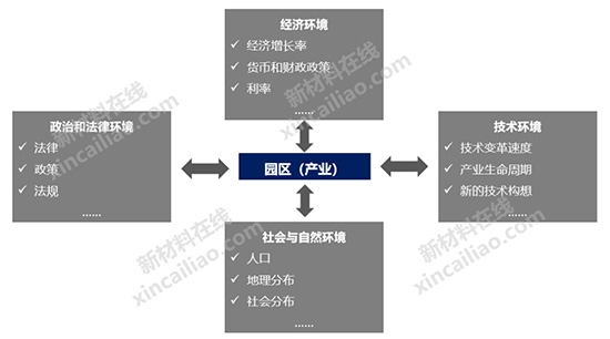 宏观环境是指影响一切行业和企业的宏观力量。对宏观环境因素做分析,一般都应对政治、经济、技术和社会这四大类影响企业的主要外部环境进行分析。这种分析方法被称为 PEST。根据分析企业或园区的特点不同,有时会对工具进行扩展和变形,如 PESTL(Politic,政治;Economic,经济;Social,社会;Technological,技术;Legal,法律),PESTELE(Politic,政治;Economic,经济;Social,社会;Technological,技术;Legal,法律;Ethical,道德;Demographic,人口)等。PEST的分析可以用头脑风暴法,可用于公司或园区的战略规划、市场规划、产品经营、研究报告等。