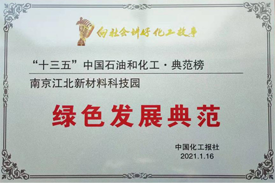 近日,南京江北新材料科技园获评“十三五”中国石油和化工典范榜・绿色发展典范。