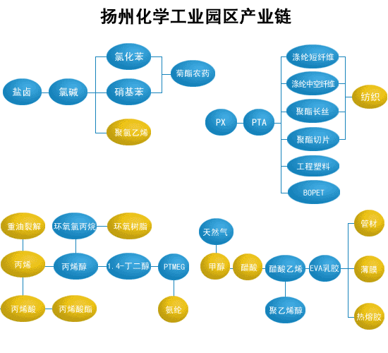 近年来,随着国际资本和制造业向长三角加速转移以及江苏沿江开发步伐的不断加快,广大中外客商十分看好扬州化工产业园区发展石化产业的有利条件,纷纷落户规划建设,集聚了中石化仪征化纤、美国尤尼发、日本东丽、台湾大连化工、中化国际、江苏优士化学、江苏瑞祥化工等一批境内外知名的石化大企业,初步构建了以乙烯、丙烯、芳烃、氯碱为龙头的四大产业链,形成了90万吨PTA、170万吨聚酯、4万吨聚酯薄膜、3万吨EVA乳胶、5万吨丙烯醇、3.6万吨1,4-丁二醇、4万吨PTMEG、2万吨顺酐、10万吨烧碱、5万吨氯化苯、1万吨对氨基苯酚以及4000吨拟除虫菊酯的生产能力,石化产业大规模集聚的发展态势日益凸现。