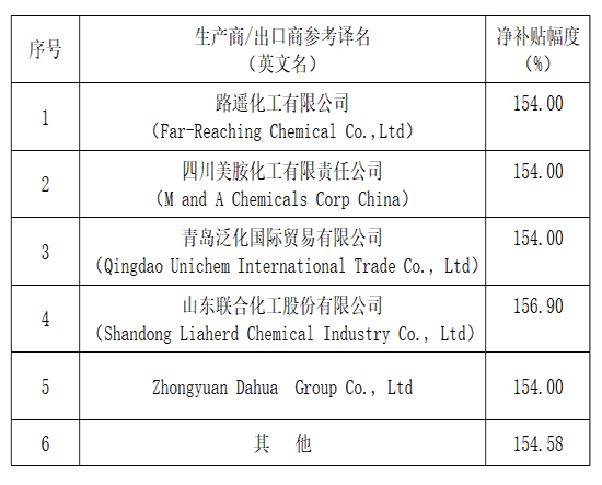 2021年2月25日,美国商务部发布公告称,对进口自中国的三聚氰胺(Melamine)作出反补贴第一次快速日落复审肯定性终裁,裁定若取消中国涉案产品的反补贴税,将导致涉案产品的政府补贴以154.00%~156.90%的幅度继续或再度发生(详见下表)。
