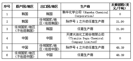 附表:印度对中国和韩国苛性钠反倾销日落复审终裁结果