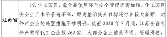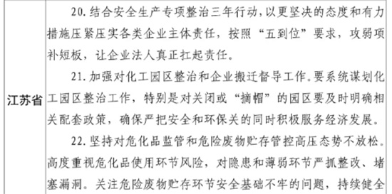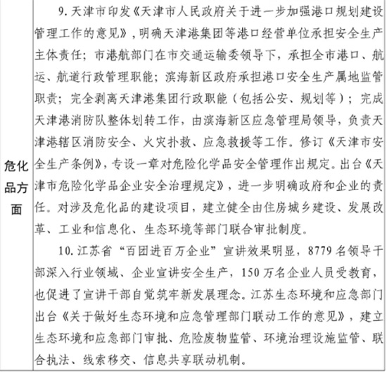 国家层面,中央办公厅、国务院办公厅印发《关于全面加强危险化学品安全生产工作的意见》;国务院认真贯彻习近平总书记重要指示,按照李克强总理批示要求,迅速成立江苏安全生产专项整治督导组,组织开展对江苏省安全生产“开小灶”,帮助江苏切实全面提高安全生产整体水平;中央纪委国家监委向江苏省委省政府发出纪检监察建议,指出江苏省在安全生产、环境保护“党政同责、一岗双责”等方面的整改方向;中央深改委将“强化危险废物监管和利用处置能力”列为2020年工作要点;国务院办公厅印发《危险化学品安全综合治理方案》、推进建立长效机制。工业和信息化部、公安部、生态环境部、交通运输部、应急部、海关总署等相关部门积极行动,组织在全国范围内开展危化品安全专项整治、非法违法“小化工”专项整治、三轮硝酸铵等爆炸性危化品安全专项排查治理、危化品道路运输安全专项整治,建立了重大危险源数据库、危险化学品安全生产风险预警系统,理顺了港口安全管理体制机制。生态环境部、应急部积极推动各地建立安全和环保联动工作机制,组织开展危险废物专项治理,先后完成全国400多个化工园区、2.1万家企业危险废物环境风险排查。