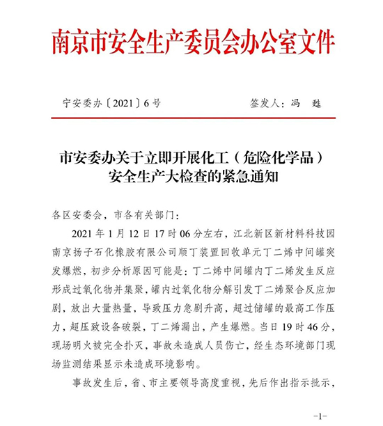 2021年1月12日17时06分左右,江北新区新材料科技园南京扬子石化橡胶有限公司顺丁装置回收单元丁二烯中间罐突发爆燃,初步分析原因可能是:丁二烯中间罐内丁二烯发生反应形成过氧化物并集聚,罐内过氧化物分解引发丁二烯聚合反应加剧,放出大量热量,导致压力急剧升高,超过储罐的最高工作压力,超压致设备破裂,丁二烯漏出,产生爆燃。当日19时46分,现场明火被完全扑灭,事故未造成人员伤亡,经生态环境部门现场监测结果显示未造成环境影响。