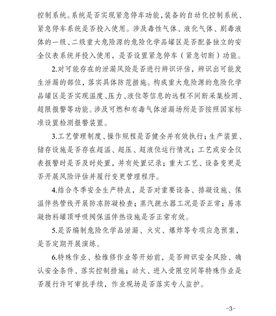 近日,江苏省安委办要求各地各部门和单位结合冬季化工(危险化学品)安全生产特点,立即组织开展化工(危险化学品)安全生产大检查,以防火、防爆、防中毒、防冻防凝、防滑、防静电为重点,对安全生产责任制和安全生产管理制度执行情况,安全管理机构设置及安全管理人员配备情况,岗位员工安全教育和操作技能培训情况,设备设施、作业活动安全风险辨识管控和隐患排查治理情况,关键储罐的防腐蚀、防泄漏情况,自动控制和安全仪表系统投用情况等开展检查,督促企业做到安全投入到位、安全培训到位、基础管理到位、应急救援到位,全面排查各类安全风险隐患,坚决防止化工(危险化学品)生产安全事故。