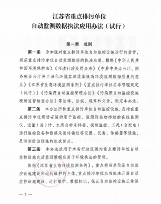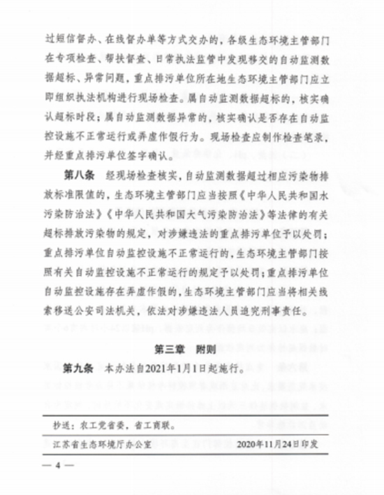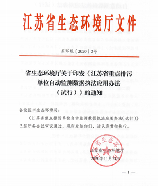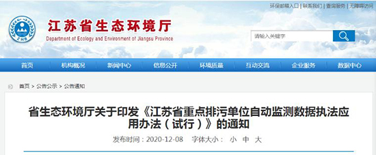 为加强对重点排污单位自动监控设施运行的监管,规范重点排污单位自动监测数据的执法应用,12月8日,江苏省生态环境厅发布了《江苏省重点排污单位自动监测数据执法应用办法(试行)》,自2021年1月1日起施行。