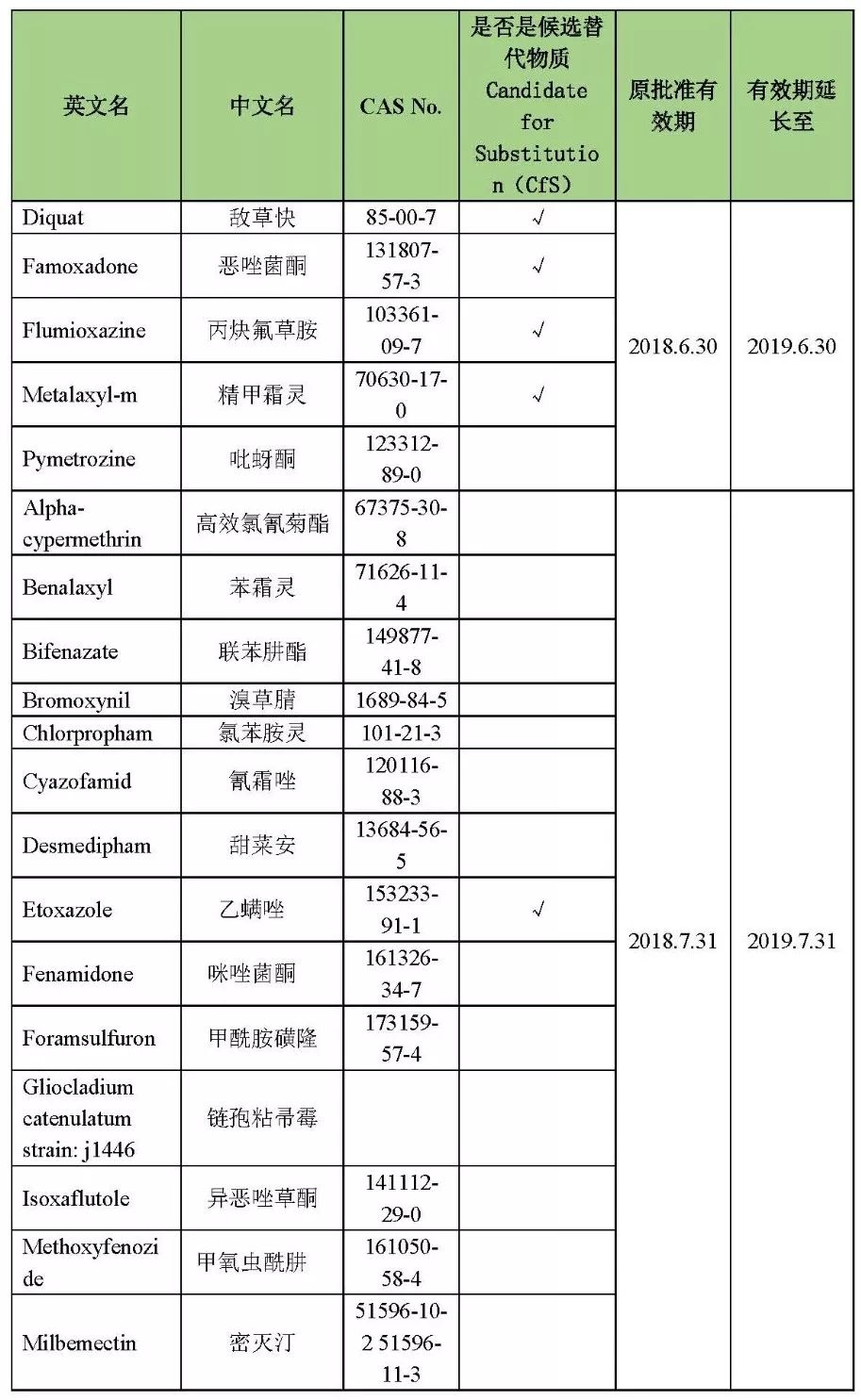 从有效期延长的活性物质清单(如下表所示)来看,42种活性物质中,有9种是候选替代物质。敌草快也位列其中。我们在上个月报道过敌草快再评审将不再获得批准,欧盟委员会正式的投票表决会议尚未召开,故延长敌草快的批准有效期。另外,2018年7月31日到期的草铵膦,并未出现在如下清单中。
