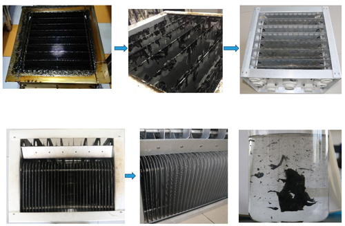 为了试验项目清洗效果,其研发团队首先进行了小试,用的管和翅片是离子箱上拆下的构件,为了产生比较,我们清洗了这个管和片的下半部分,能够明显看到,清洗的下半部分表面干净光洁,并且污垢较为轻松的呈膜状被剥离下来,并且不伤害其本身。小试成功之后,为了继续验证,其团队又克服许多未知困难做了一台用于技术可行性验证的中试装置,这次直接对饭店拆下来的沾满油污的离子箱进行清洗,反应完成之后,有着良好的效果。油污像紫菜一样被剥离下来,清洗后的箱体返回商家回馈意见也很好。