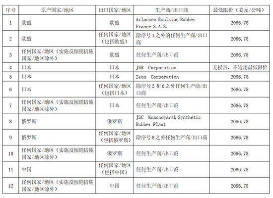 2021年5月12日,印度商工部发布公告称,对原产于或进口自中国、欧盟、日本和俄罗斯的丁腈橡胶(Acrylonitrile Butadiene Rubber)作出反倾销终裁,建议对中国、欧盟、日本和俄罗斯的涉案产品征收为期5年的反倾销税,税额为进口商品报关价(landedvalue,前提是低于最低限价)与最低限价(见附表)的差额部分。液态丁腈橡胶、乳胶丁腈橡胶、粉末丁腈橡胶和羧化丁腈橡胶不适用本案反倾销措施。本案涉及印度海关编码40025900项下的产品。