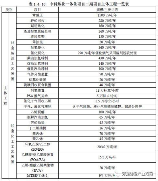 中科炼化一体化项目一期规模后调整为1000万吨/年炼油能力,80万吨/年乙烯生产能力。
