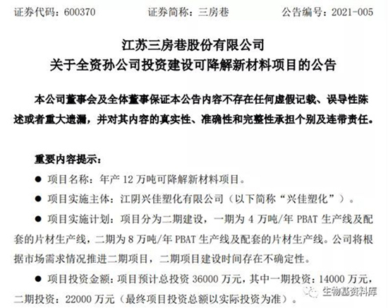 2021年2月份,三房巷集团(600370)对外公开,其子公司江阴兴佳塑化有限公司拟建设投建年产12万吨PBAT项目。除以上一期年产4万吨可降解新材料项目外,公司还将斥资2.2亿元投资二期8万吨/年PBAT生产线及配套的片材生产线。