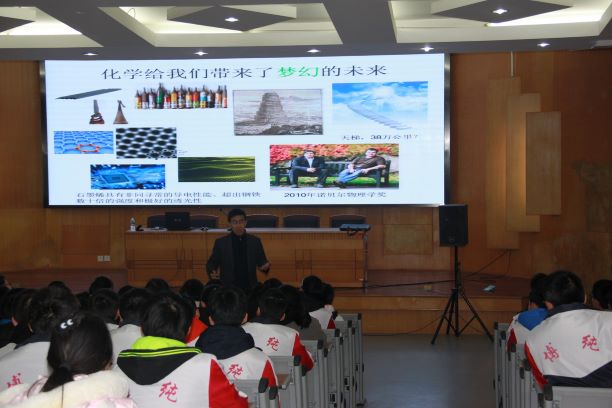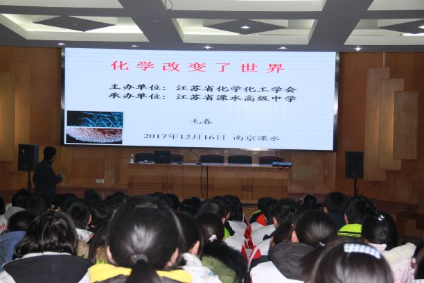 2017年12月16日下午,江苏省化学化工学会科普专家分团一行2人走进江苏省溧水高级中学,开展科普进校园活动。200余名师生听取了首席科技传播专家团应急科普专家分团团长、南京师范大学化学与材料科学学院副院长毛春教授作的题为:化学改变了世界”的科普报告。毛春教授不仅详细介绍了“化学与食品”,“化学与药品”,“化学与环境”三大主题,而且通过化学对人类、对社会、对环境的正反两方面影响的实际案例,向中学生们讲述了化学的多样性、复杂性,以及对世界的巨大贡献和深刻改变力。同时,与在场学生进行了多次互动。学生们听的津津有味,热情高涨,整个科普报告生动有趣,引起了学生的强烈反响。并表示对今后的化学学习更加充满热情,更有多位同学当即表示将来要投身化学研究领域,立志成为一名化学家。